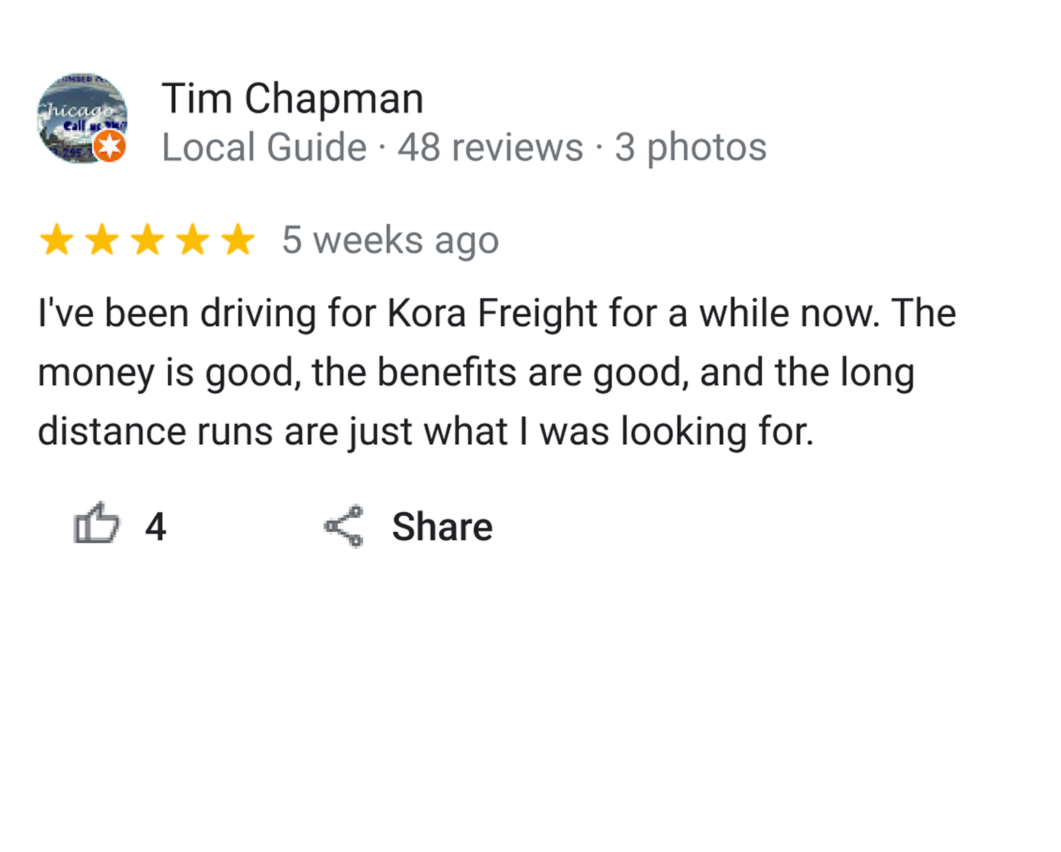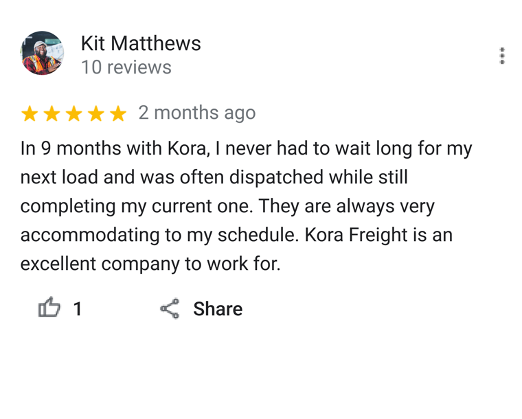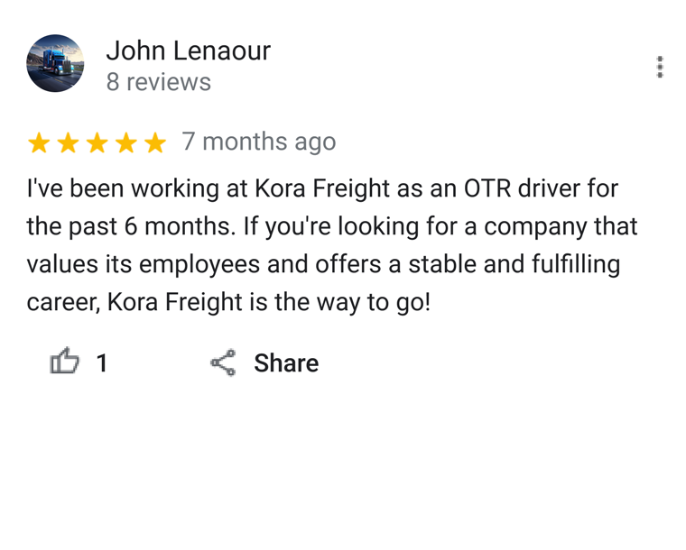 "If you're looking for a company that values its employees and offers a stable and fulfilling career, Kora Freight is the way to go!"
